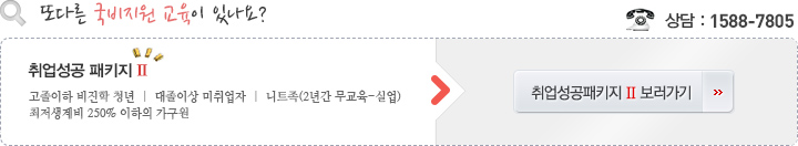 [국비무료] 취업성공패키지 I 2013.04.22 참여대상자 ① 기초생활수급자(조건부수급자, 시설보장수급자) ② 최저생계비 150% 이하의 가구원 ③ 여성가장 ④ 영세자영업자(연 매출액 8천만원 미만) ⑤ 건설일용직근로자(최근 180일 중 30일 이상 건설일용직으로 근로한 자)