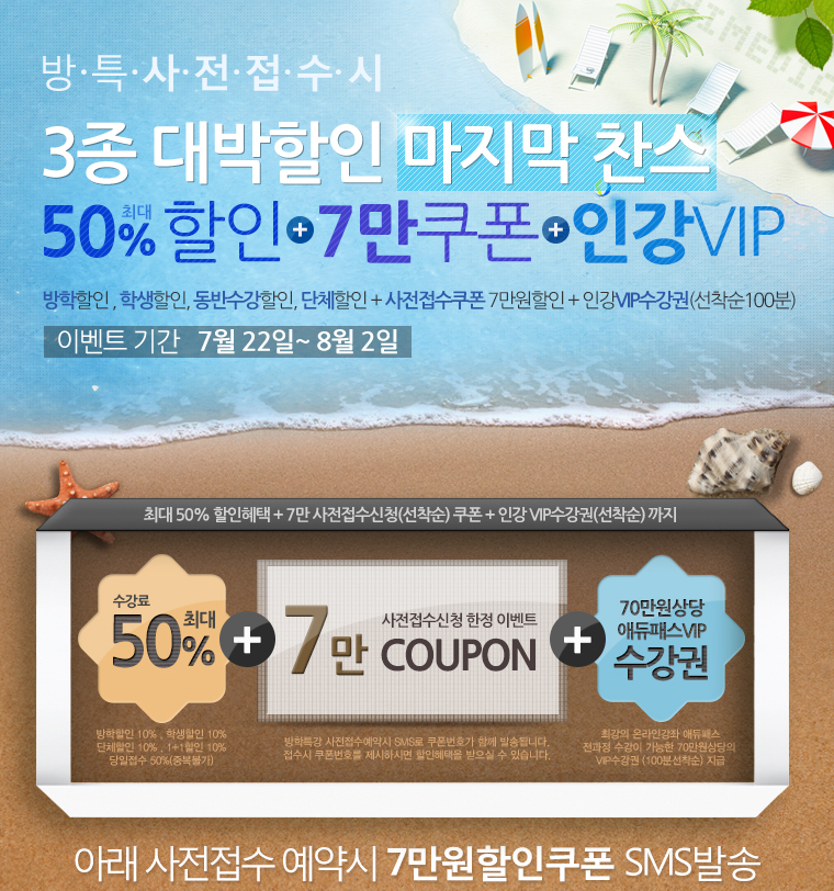 [이벤트]여름방학특강 사전접수 할인 이벤트 2013.05.29 여름방학특강 사전접수이벤트 이벤트 기간내에 사전접수 하시면 7만원 할인쿠폰(최대50%할인)를 SMS문자로 받으 실 수 있습니다.